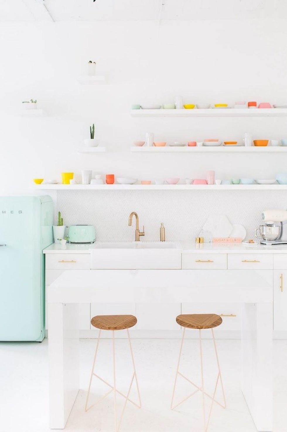 2. Pops of Gold: Are you obsessed with this lively look as much as we are? Combine gold finishes with mint and pink for a mod-meets-vintage design. (via Sugar & Cloth)