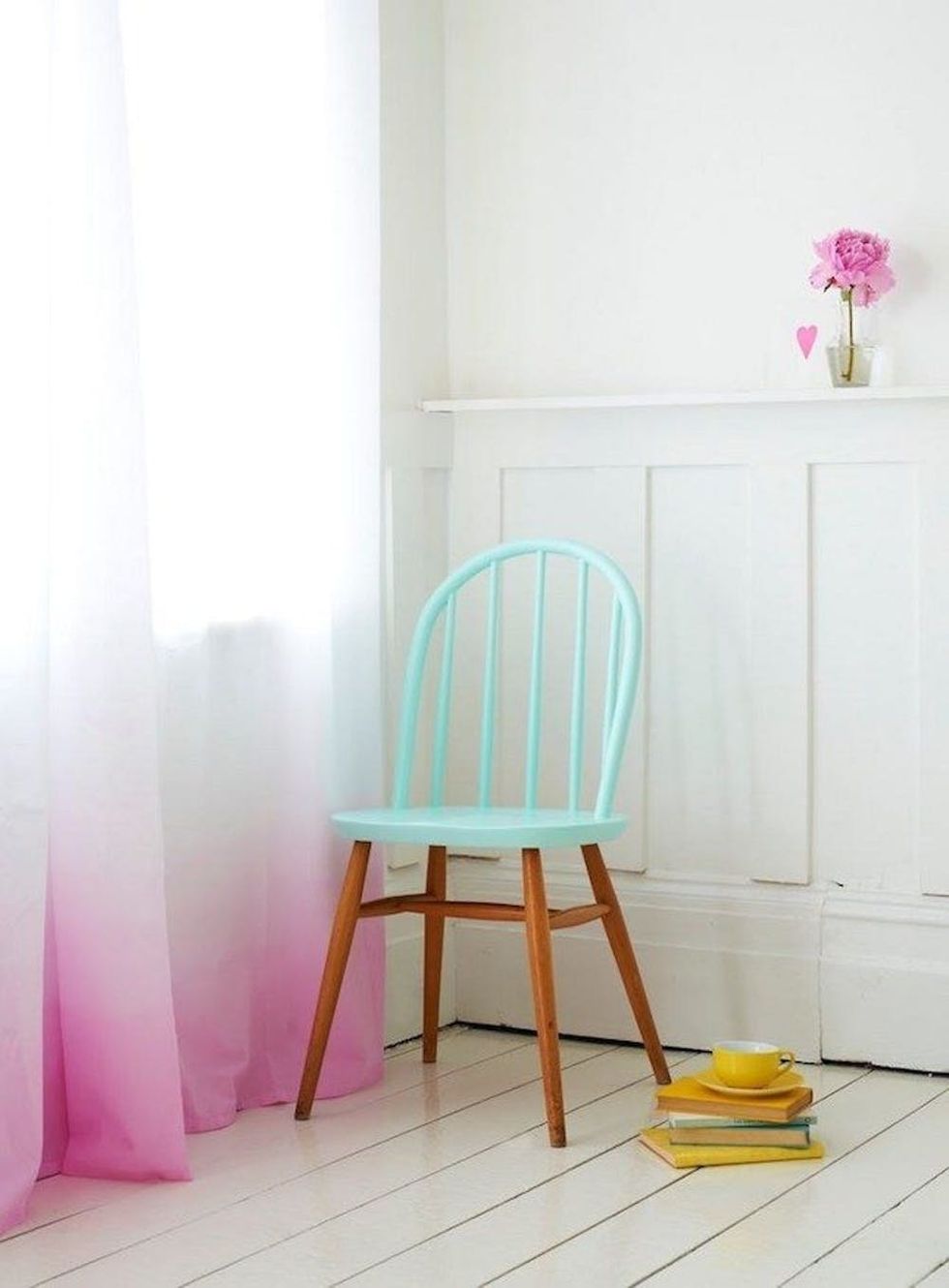5. Bold Ombre: Bring in some whimsy with an airy, pink ombre curtain, then paint half of a chair or stool to add minty flair. The combination will bring in those playful vibes without totally stealing the decor show. (via Charlotte Lovey)